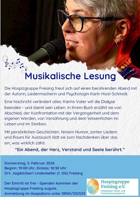 Bekannt als ein Teil der Bayerischen Mundart-Gruppe "Schmidtanand" hat Karin Hoisl-Schmidt nun ein Buch geschrieben über die intensive Woche am Sterbebett ihres Vaters mit dem Titel "Sieben Tage Sterben und ein ganzes Leben". Sie wird auch ihre Gitarre zur Lesung mitbringen und im Anschluss die Bücher signieren.